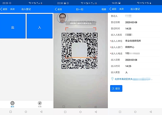 院领导和所领导班子对疫情防疫期间智慧农科和智慧院区对居家办公信息化支撑工作给予高度关注,针对他们提出的院区人员出入管控的需求,孙志国、于涛、刘洋、王晓丽紧急成立设计开发小组,利用两天时间开发了扫描智慧农科二维码进行快速人员登记认证的程序,供院区大门门卫使用,并于2月9日上午在孙坦副院长等院所(中心)各级领导的现场指导下在中关村院区进行了测试,该方式有别于传统的证件通行方式,可实现出入人员记录的可追溯,后续可根据该方式构建全院访客系统。